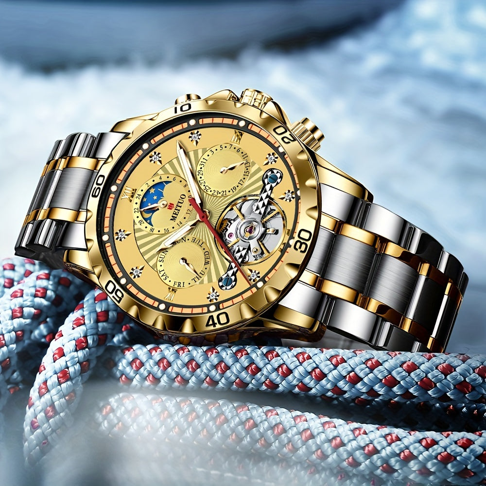 Men's Automatic Watch Stainless Steel Strap Three Dial Date Moon Phase Week Mechanical Watch, Ideal choice for Gifts